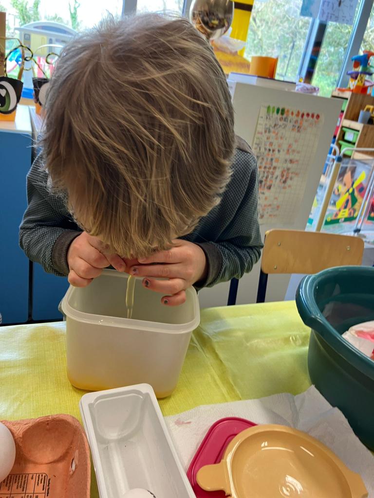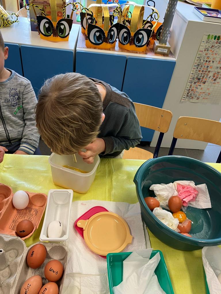 De uitgeblazen eieren gaan we versieren en de inhoud morgen bakken.
