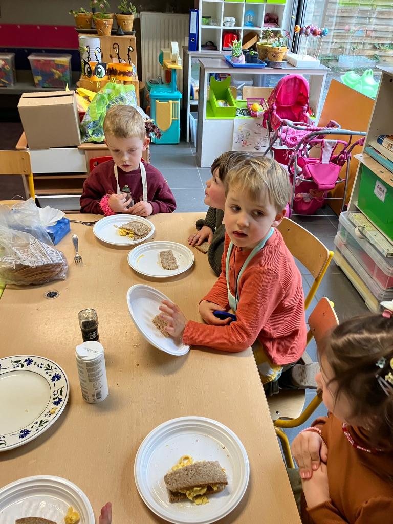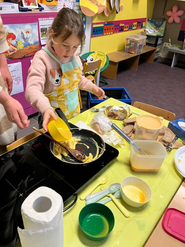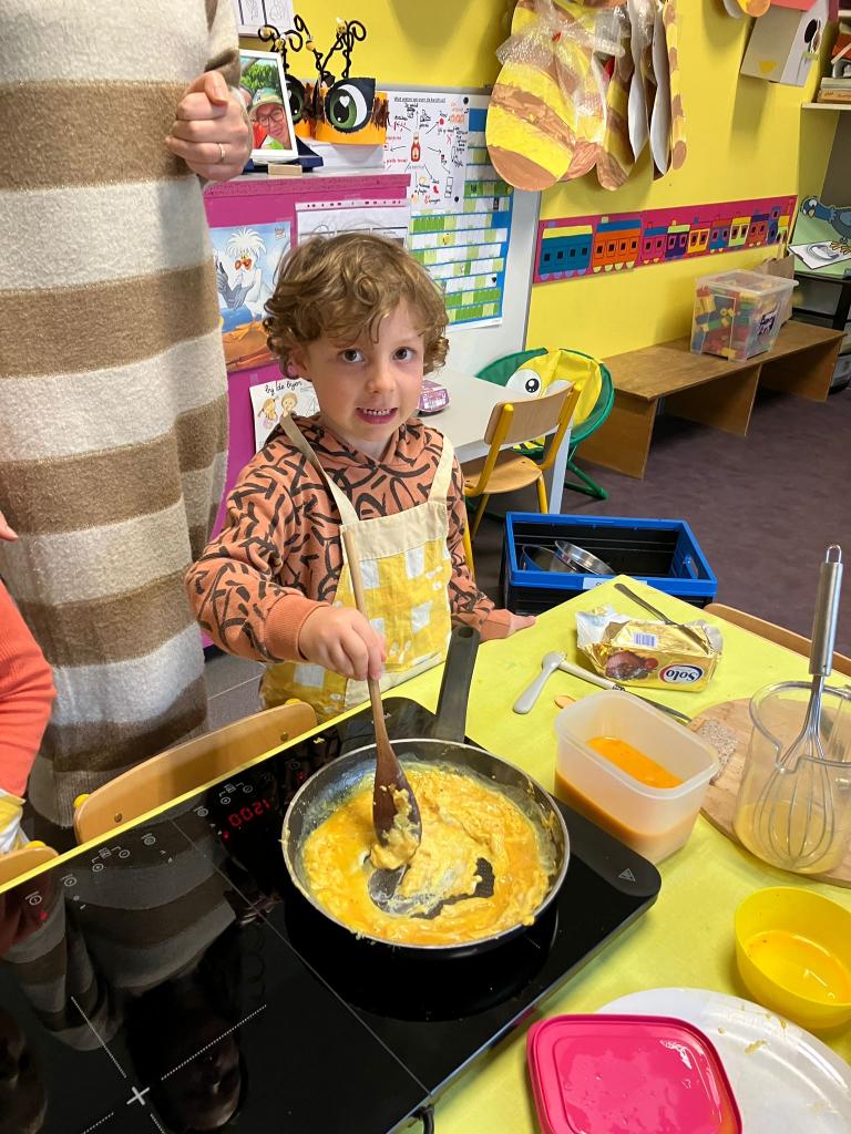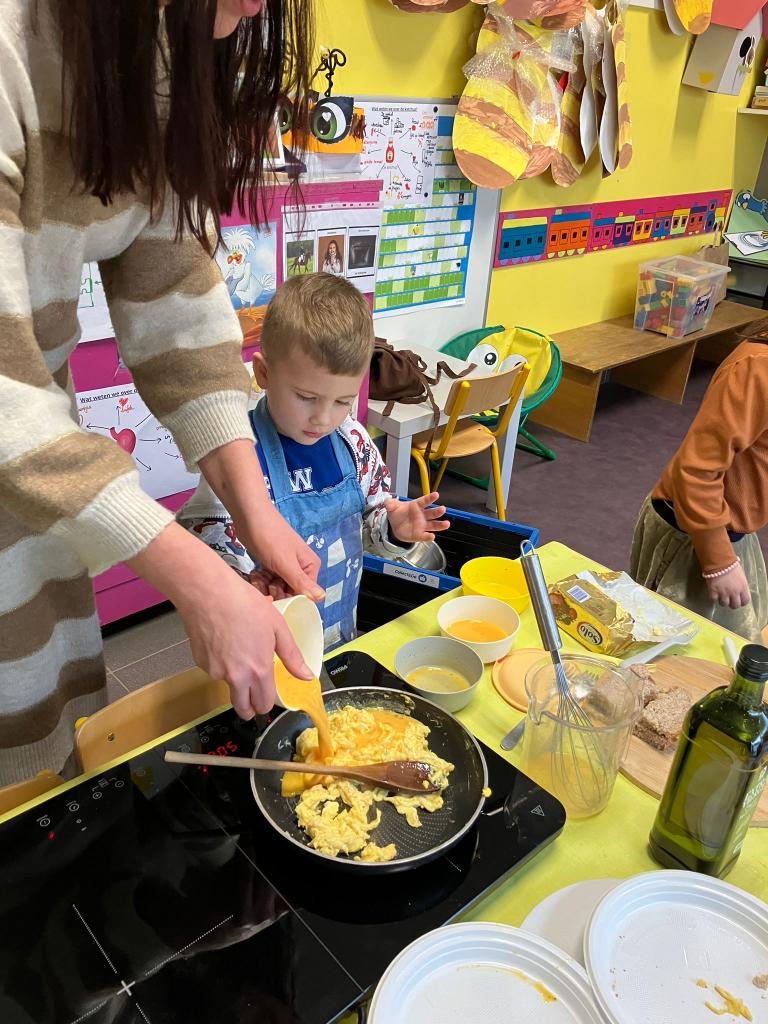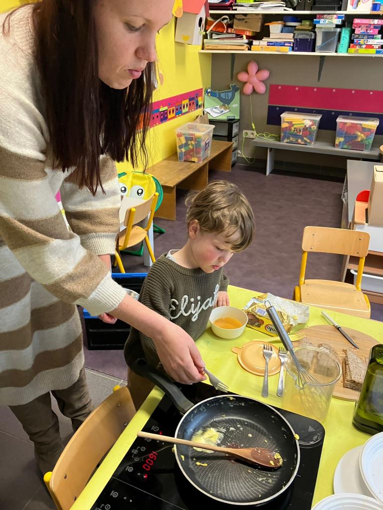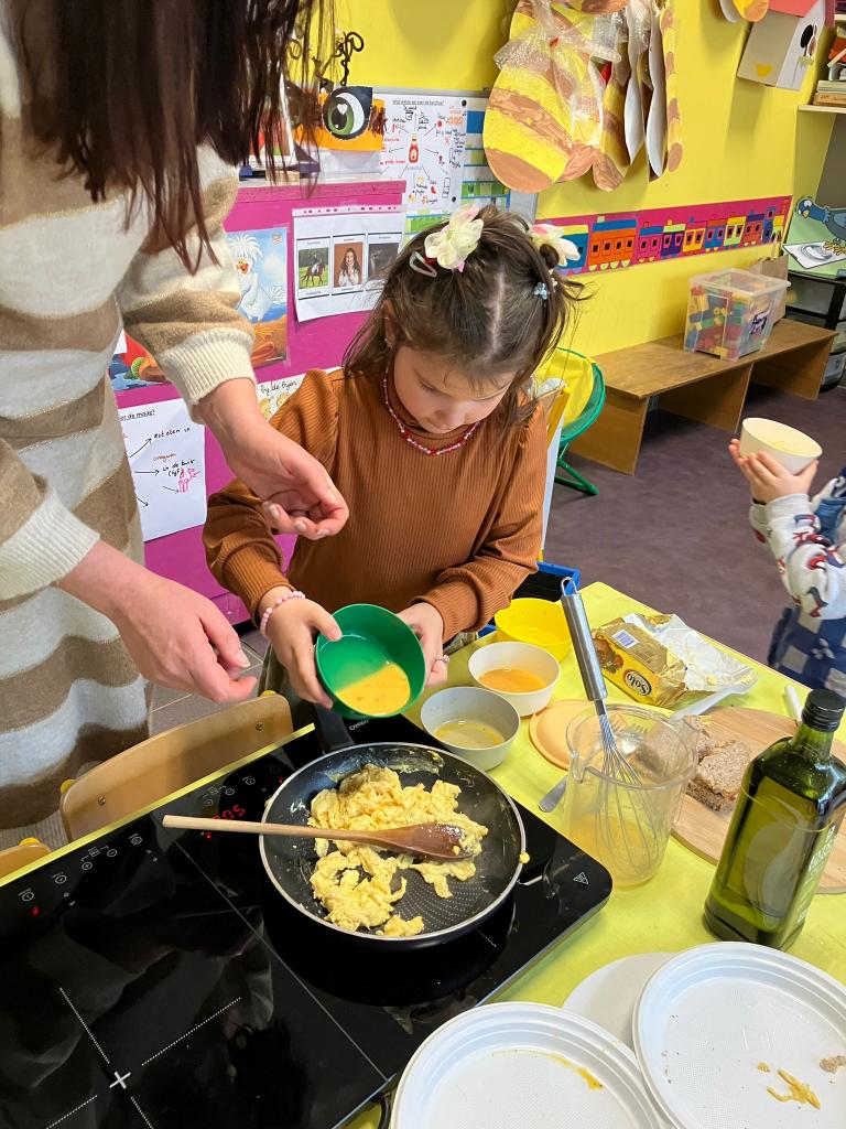 Vrijdagnamiddag 13 maart kwam klasse-ouder Hanne, mama van klasgenootje Tuur, naar de klas om eitjes te bakken.