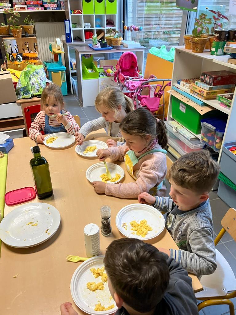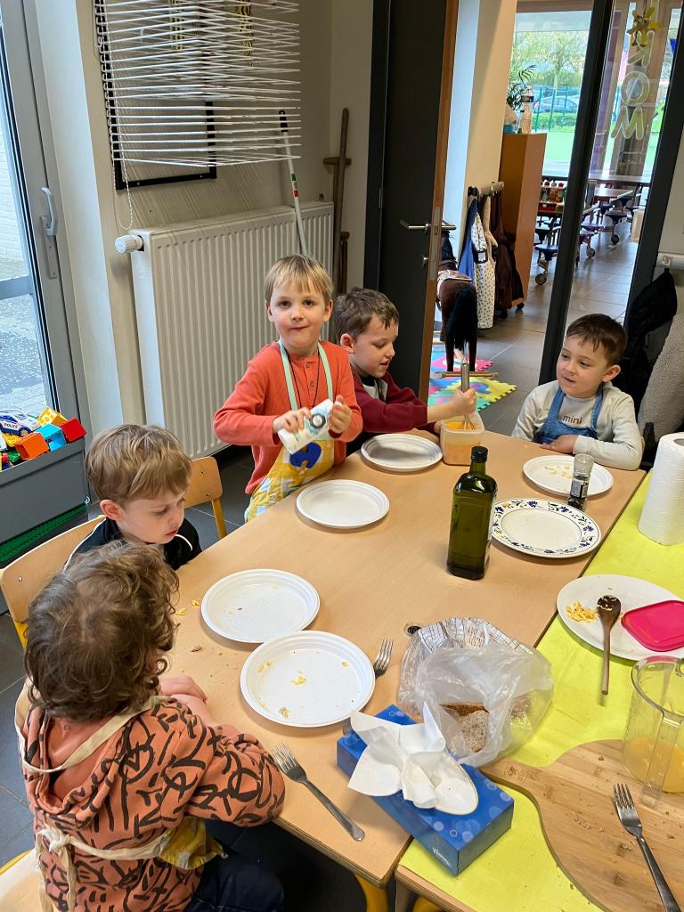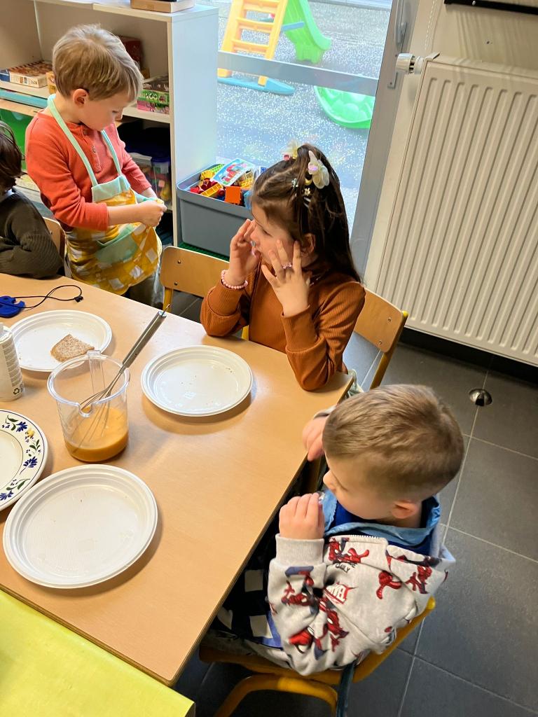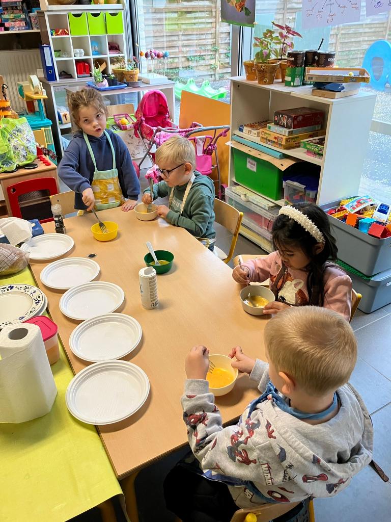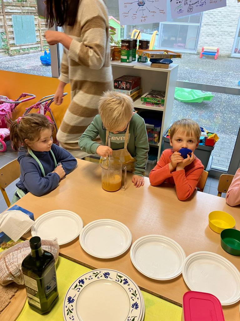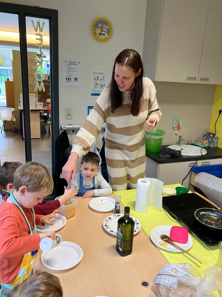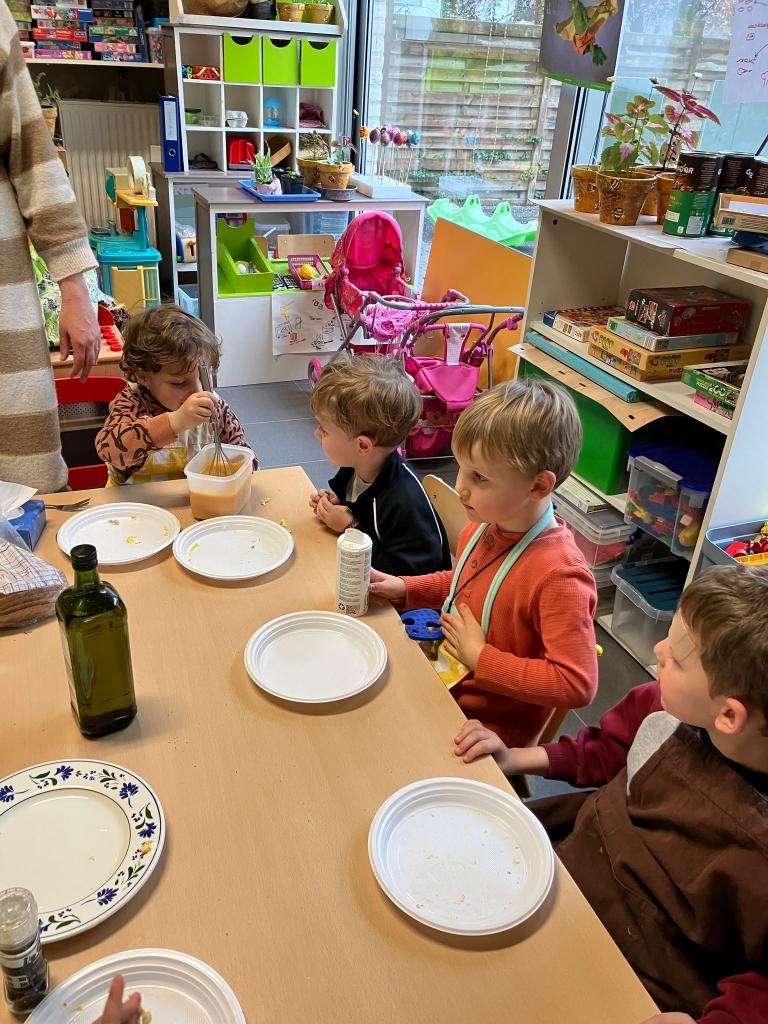 In groepjes mochten de kleuters roeren, kruiden, bakken en natuurlijk..smullen.