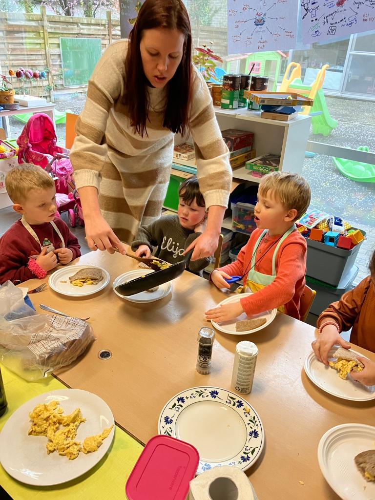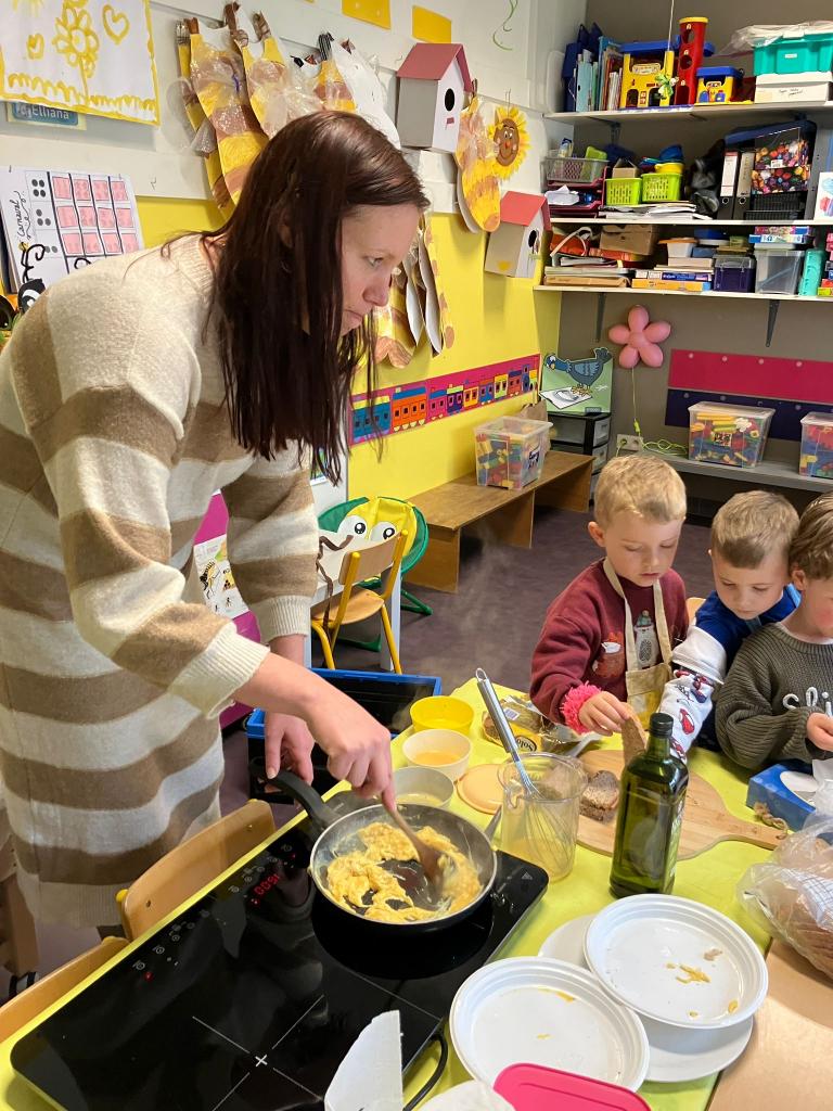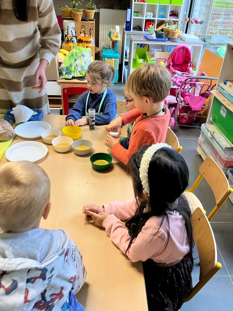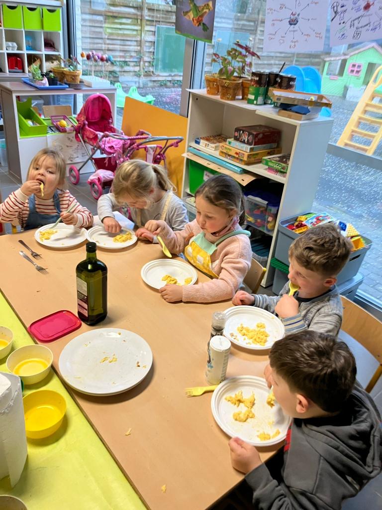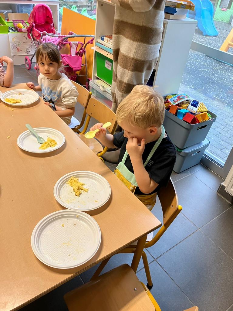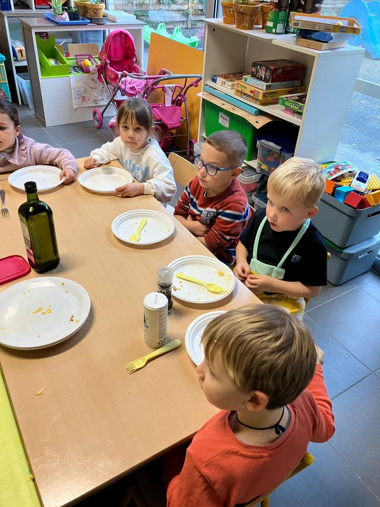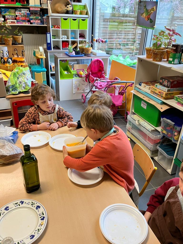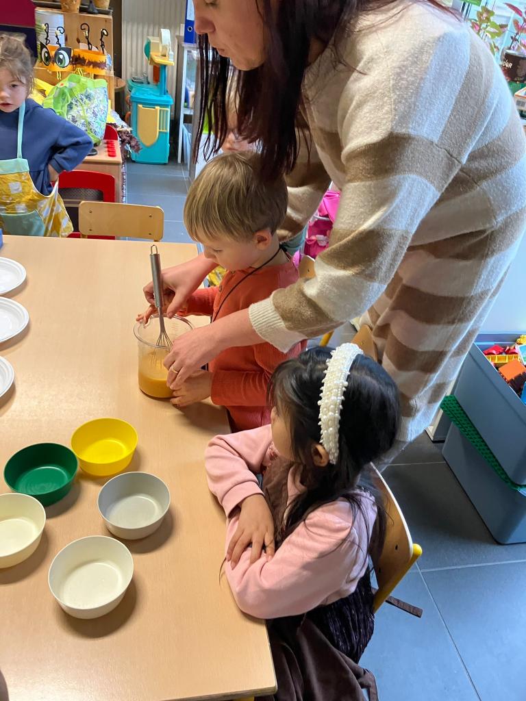 In groepjes mochten de kleuters roeren, kruiden, bakken en natuurlijk..smullen.