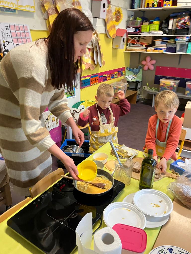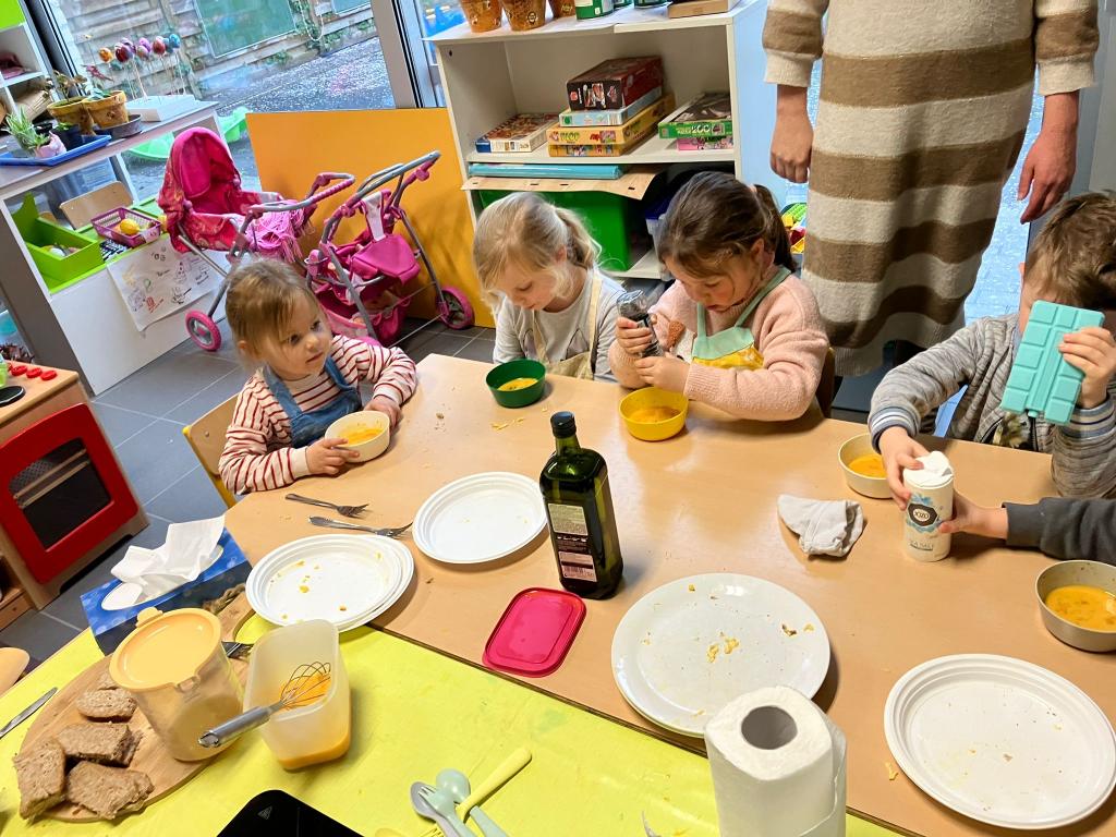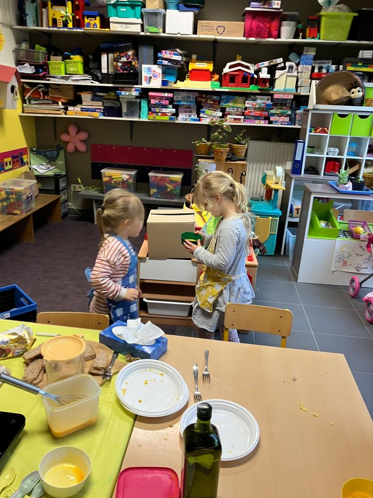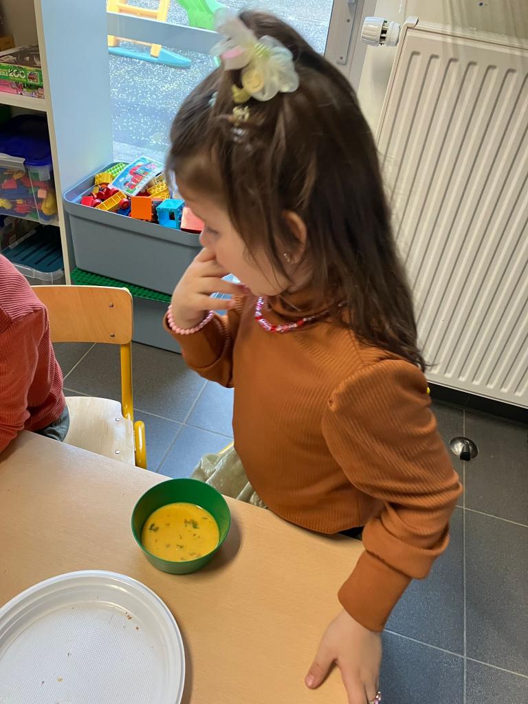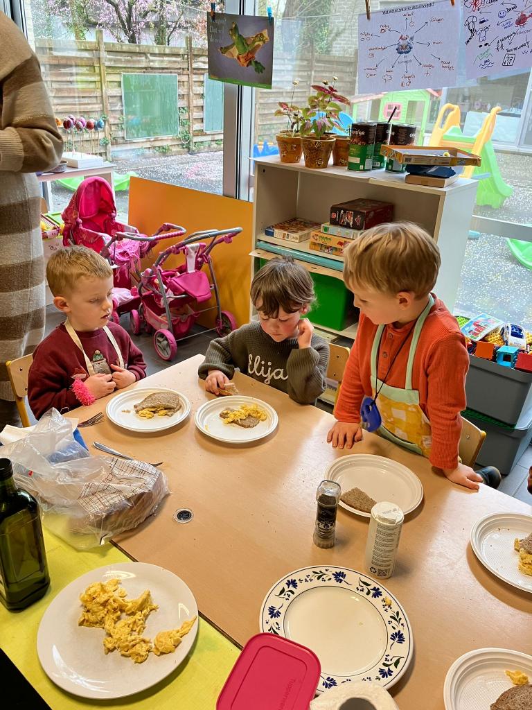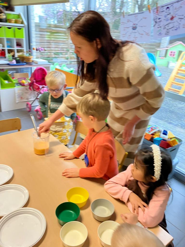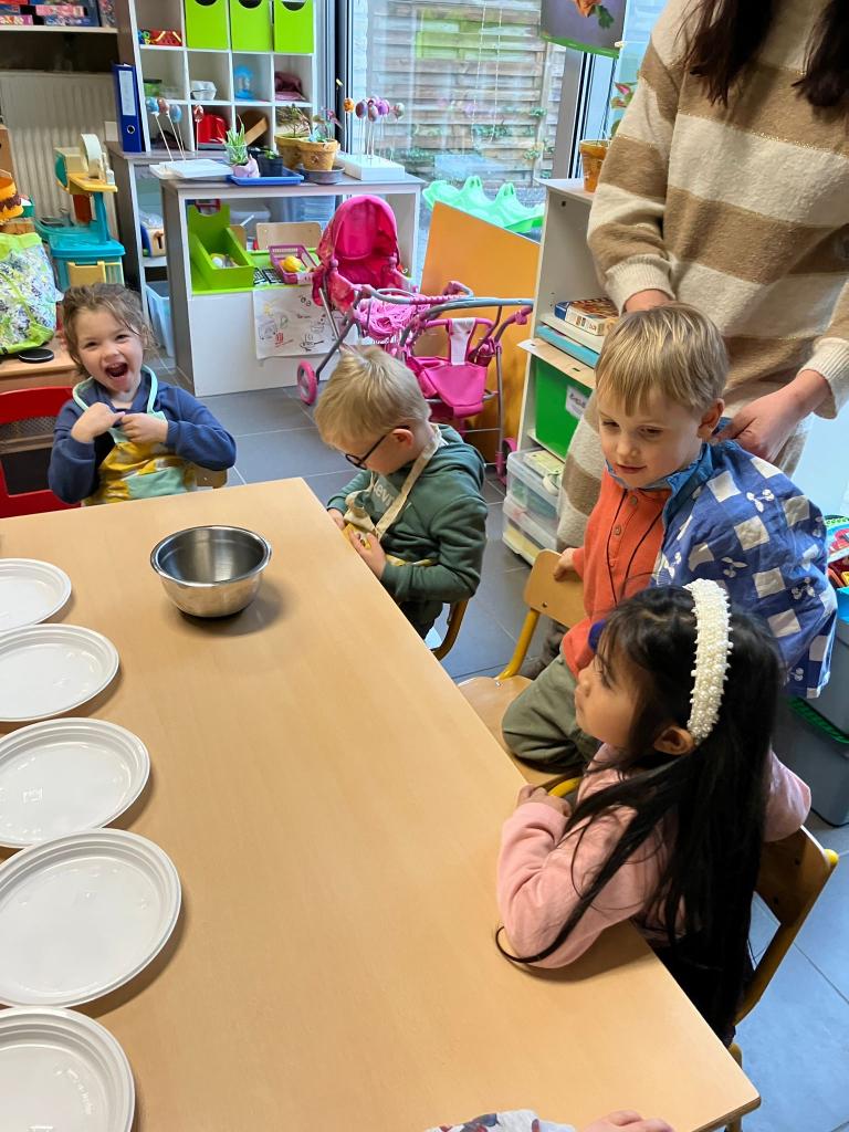 In groepjes mochten de kleuters roeren, kruiden, bakken en natuurlijk..smullen.