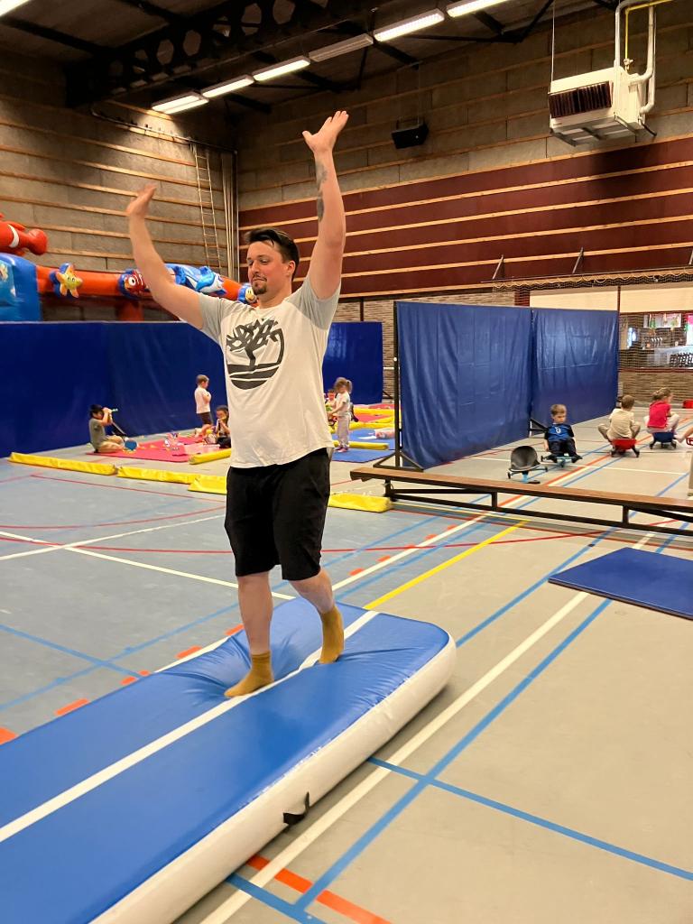 Wegens het ontbreken van een trampoline waagde hij zich zelfs aan een uitgestrekte koprol als volleerde turner.